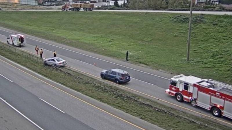 An image from DriveBC shows a vehicle propped up against the median of Hwy. 1 just east of Prest Road (exit 123), partially blocking the left lane.